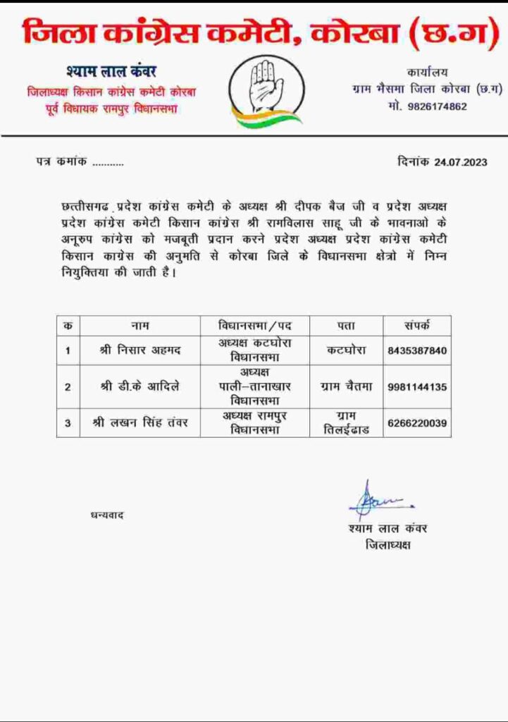 रायपुर/कोरबा(खटपट न्यूज़)। छत्तीसगढ़ प्रदेश कांग्रेस कमेटी के प्रदेशाध्यक्ष दीपक बैज एवं रामविलास साहू प्रदेशाध्यक्ष किसान कांग्रेस कमेटी छत्तीसगढ़ के भावनाओं के अनुरूप श्याम लाल कंवर, जिलाध्यक्ष किसान कांग्रेस कोरबा द्वारा कोरबा जिले के विधानसभाओं में विधानसभा अध्यक्षों की नियुक्तियां की गई है। इनमें पाली-तानाखार विधानसभा से डी.के आदिले, रामपुर विधानसभा से लखन सिंह तंवर एवं कटघोरा विधानसभा से निसार अहमद को विधानसभा अध्यक्ष मनोनीत किया गया है।