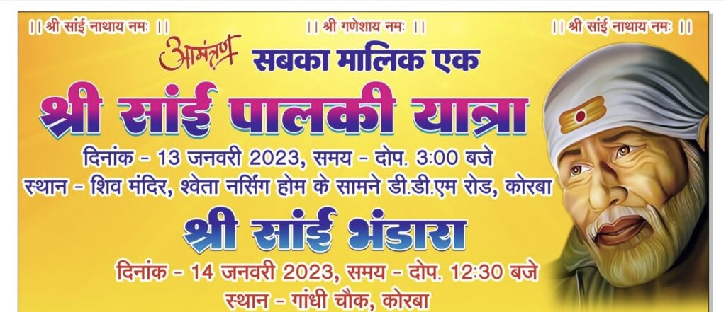 कोरबा(खटपट न्यूज़)। प्रति वर्ष अनुसार इस वर्ष भी श्री साईं बाबा सेवा समिति गांधी चौक, कोरबा के द्वारा साईं बाबा की भव्य पालकी यात्रा का आयोजन किया जाएगा। 13 जनवरी 2023 को दोपहर 3 बजे पावर हाउस रोड स्थित श्वेता नर्सिंग होम के सामने से यात्रा प्रारंभ होगी। पावर हाउस रोड, पुराना पवन टॉकीज, मुख्य मार्ग से होते हुए सप्तदेव मंदिर पहुंचकर वहां से वापस रानी रोड, पुरानी बस्ती होकर गांधी चौक प्रांगण में यह यात्रा संपन्न होगी। शोभायात्रा में परंपरागत सुआ नृत्य, डीजे, बाबा की जीवंत झांकी विशेष आकर्षण का केंद्र रहेंगे। इसके दूसरे दिन 14 जनवरी को गांधी चौक परिसर में दोपहर 12:30 से बाबा के विशाल भंडारा का आयोजन रखा गया है। श्री साईं बाबा सेवा समिति के द्वारा आयोजनों को लेकर तैयारियां की जा रही हैं। आयोजन समिति ने नगरजनों/ भक्तों से आग्रह किया कि वे पालकी यात्रा और भंडारा में शामिल होकर पुण्य लाभ प्राप्त करें।