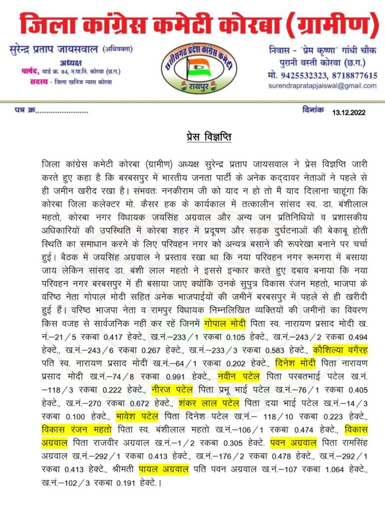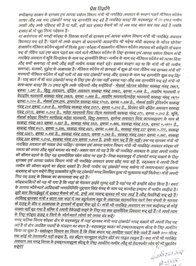 पहले भाजपा जिला अध्यक्ष डॉ. राजीव सिंह, रामपुर विधायक व पूर्व गृहमंत्री ननकीराम कंवर ने राजस्व मंत्री व कोरबा विधायक व जयसिंह अग्रवाल के परिजनों तथा करीबियों के जमीनों को बरबसपुर में होना उजागर कर इसी वजह से नया ट्रांसपोर्ट नगर बसाने के लिए जिद्द करने पर आड़े हाथों लिया। दूसरी तरफ अब जिला कांग्रेस कमेटी ग्रामीण के अध्यक्ष सुरेन्द्र प्रताप जायसवाल ने पूर्व में विधायक जयसिंह अग्रवाल द्वारा रुमगरा में नया ट्रांसपोर्ट नगर बसाने के प्रस्ताव के विरुद्ध तत्कालीन सांसद डॉ. बंशीलाल महतो के द्वारा बरबसपुर में ट्रांसपोर्ट नगर बसाने के प्रस्ताव पर कारण उजागर करते हुए भाजपा नेताओं के नाम सार्वजनिक किए हैं, जिनकी जमीन यहां मौजूद है।