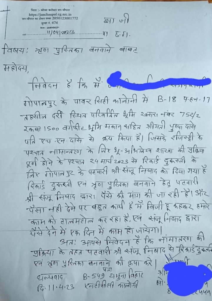 कोरबा(खटपट न्यूज़)। स्वयं मुख्यमंत्री श्री भूपेश बघेल द्वारा बरती जा रही गंभीरता और राजस्व मंत्री द्वारा अमले को सही से काम करने की बार-बार चेतावनी और कलेक्टर द्वारा बैठकों में बार-बार निर्देश दिए जाने के बाद भी राजस्व संबंधी कार्यों के लिए फरियादियों को घुमाया जा रहा है।पटवारियों को लेकर एक और शिकायत सामने आई है।