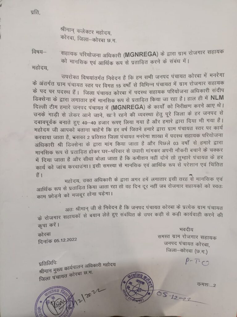 कोरबा(खटपट न्यूज़)। मनरेगा के सहायक परियोजना अधिकारी के द्वारा रोजगार सहायकों को आर्थिक व मानसिक रूप से प्रताड़ित किया जा रहा है। परेशान रोजगार सहायकों ने कलेक्टर को ज्ञापन सौंपकर कार्यवाही की मांग की है।