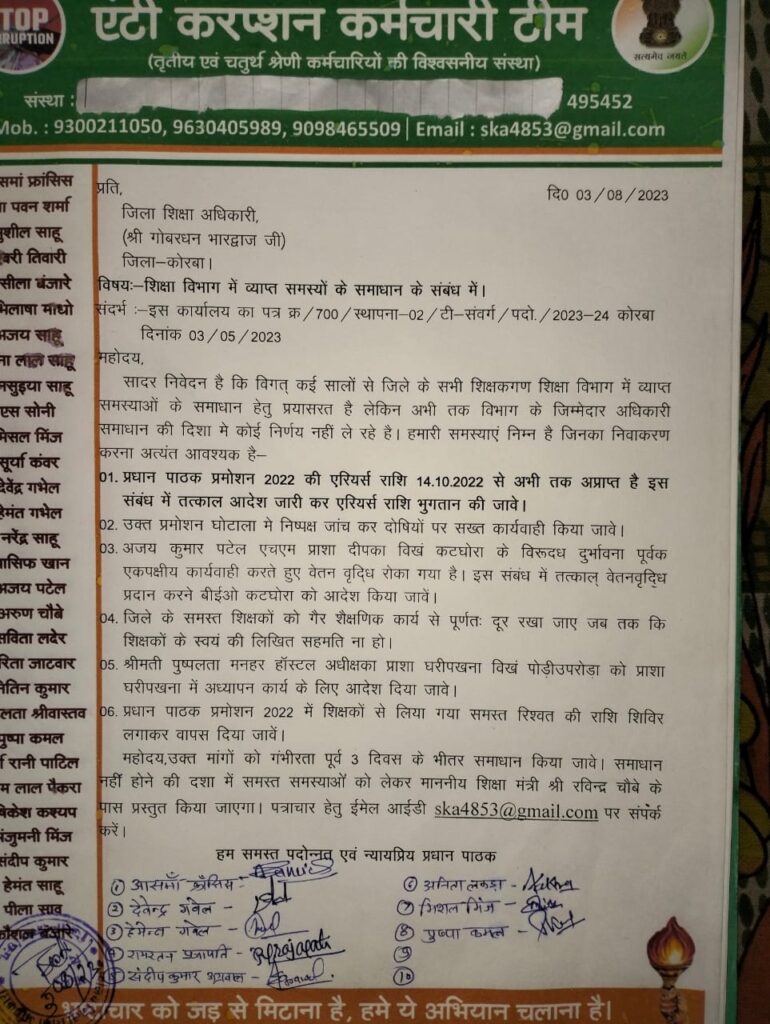 जिला शिक्षा विभाग में व्याप्त समस्याओं पर एंटी करप्शन कर्मचारी टीम के द्वारा डीईओ गोवर्धन भारद्वाज के नाम ज्ञापन सौंपा गया है। प्रधान पाठक प्रमोशन 2022 की एरियर्स राशि 14 अक्टूबर 2022 से अब तक अप्राप्त है, एरियर्स राशि भुगतान किया जाए। प्रमोशन घोटाला में निष्पक्ष जांच कर दोषियों पर सख्त कार्यवाही करें। प्राथमिक शाला दीपका के प्रधान पाठक अजय कुमार पटेल के विरूद्ध दुर्भावनापूर्वक एक पक्षीय कार्यवाही कर रोकी गई वेतनवृद्धि पर कटघोरा बीईओ को आदेश देने तथा जिले के समस्त शिक्षकों को गैर शैक्षणिक कार्यों से पूर्णत: दूर रखने, हॉस्टल अधीक्षिका प्राथमिक शाला घरीपखना श्रीमती पुष्पलता मनहर विकासखंड पोड़ी-उपरोड़ा को प्राथमिक शाला घरीपखना में अध्यापन कार्य के लिए आदेश देने, प्रधान पाठक प्रमोशन 2022 में शिक्षकों से लिए गए समस्त रिश्वत की राशि शिविर लगाकर वापस देने की भी मांग की गई है। 3 दिवस के भीतर समाधान न होने पर शिक्षा मंत्री रविन्द्र चौबे के समक्ष प्रस्तुत किया जाएगा।