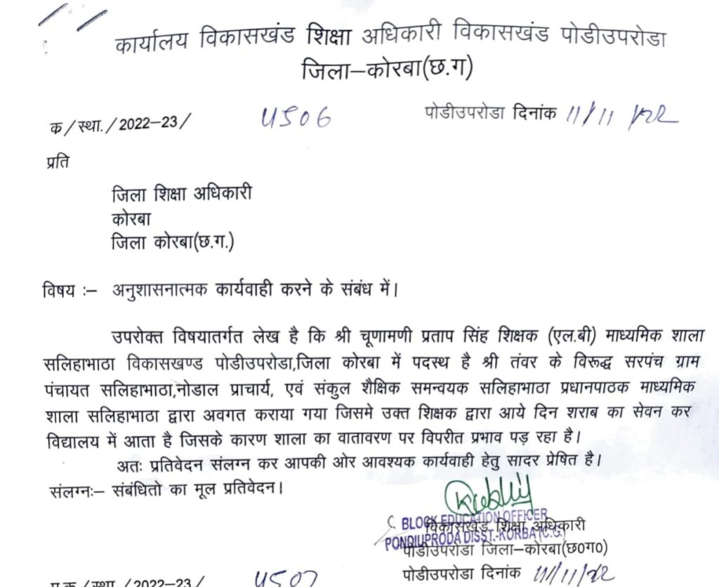 कोरबा(खटपट न्यूज़)। जिला शिक्षा विभाग के अंतर्गत पोड़ी-उपरोड़ा विकासखंड के ग्राम सलिहाभाटा स्थित माध्यमिक शाला में पदस्थ शिक्षक एलबी चूड़ामणि प्रताप सिंह शराब के नशे में स्कूल पहुंचते हैं। उनकी इस हरकत से विद्यालय का वातावरण खराब होने के साथ-साथ बच्चों में भी भय व्याप्त रहता है।