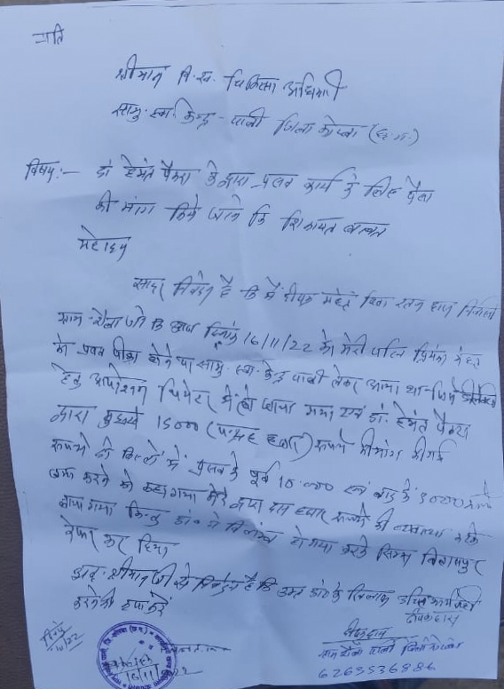 यह मामला कोरबा जिला के पाली विकास खण्ड स्थित सामुदायिक स्वास्थ्य केन्द्र का है।ग्राम सैला निवासी दीपक महंत की पत्नी प्रियंका महंत को प्रसव पीड़ा होने पर मितानीन के साथ सुबह करीब 10 बजे सामुदायिक स्वास्थ्य केन्द्र पाली लाया गया।ड्यूटी पर डॉक्टर हेमंत पैकरा उपस्थित थे। वे महिला को देखते ही समझ गये कि इसे आपरेशन से ही प्रसव कराया जा सकता है और वे पीड़िता को सीधे आपरेशन थियेटर ले गये और आपरेशन की तैयारी में लग गये। डाक्टर ने अपने केबिन में मितानिन को बुलाया,कुछ देर बाद बाहर आकर मितानिन ने 10 हजार रुपये जमा कराने की बात कही। मितानिन के द्वारा परिजनों को पन्द्रह हजार रुपये खर्च आयेगा बताया गया। पहले दस हजार रुपये जमा करने कहा गया। परिजन आनन-फानन में रूपए की व्यवस्था में लग गये। जब तक पैसे की व्यवस्था की गयी तब तक विलंब हो चुका था। पैसे की व्यवस्था के दौरान दीपक को फोन पर इलाज बन्द कर देने की जानकारी दी गई। बताया कि पैसा देने में विलंब से गुस्साये चिकित्सक ने पीड़ित महिला को आपरेशन थियेटर से निकाल रेफ़र कागज तैयार कर दिया। सरकारी अस्पताल में डाक्टर के इस प्रकार की प्रताड़ना से ग्रसित सैला निवासी दीपक महंत ने खण्ड चिकित्सा अधिकारी से उक्त चिकित्सक की है।