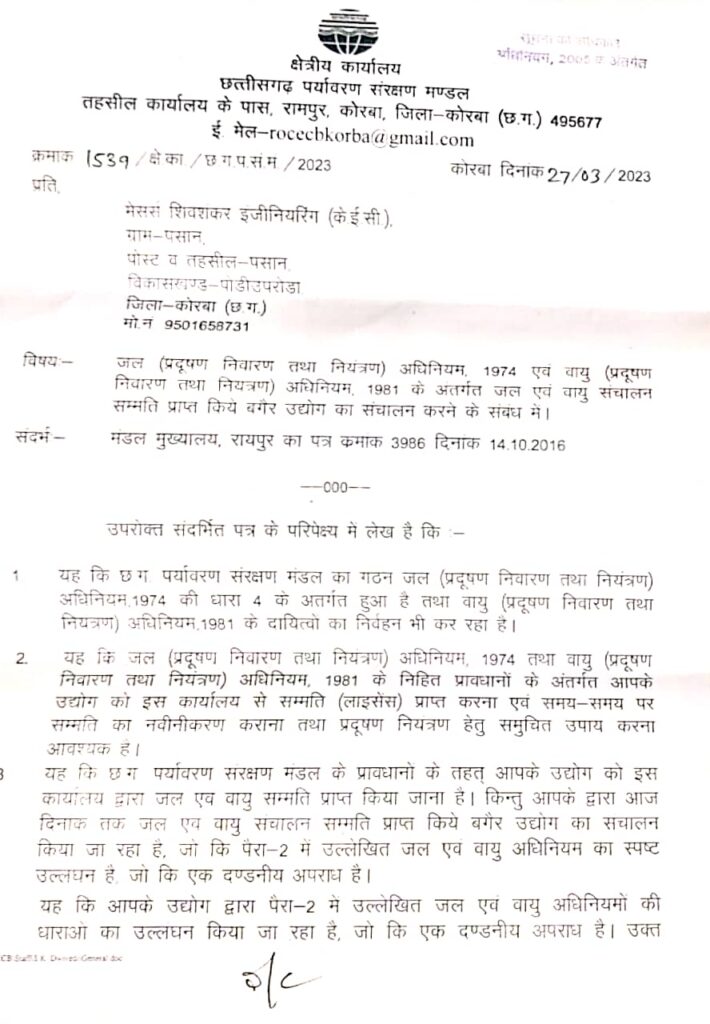 कोरबा(खटपट न्यूज़)। ग्राम पंचायत पसान के रिहायशी एरिया में शिवशंकर इंजीनियरिंग का कांक्रीट प्लांट संचालित हो रहा है। इसके 10 मीटर की दूरी पर प्राथमिक विद्यालय है जहाँ पहली से पाचवीं के छोटे-छोटे बच्चे पढ़ाई करते हैं। ऐसे जगह पर नियम विरुद्ध तथा बिना पर्यावरण विभाग के अनुमति के कंक्रीट प्लांट को चालू किया गया है जिससे वहां के आमजन के साथ विद्यालय के बच्चे भी प्रभावित हो रहे हैं। ग्रामीण लोगों की शिकायत पर पर्यावरण मंडल ने नोटिस जारी किया है कि 7 दिवस के भीतर अनुमति के लिए सशुल्क आवेदन करें नहीं तो प्लांट के संचालक पर कार्यवाही की जायेगी।