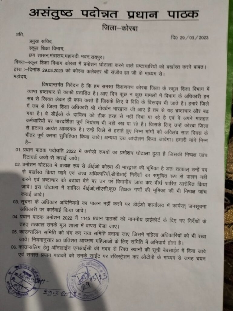 KORBA:DEO को बर्खास्त करने प्रमुख सचिव से मांग,असंतुष्ट प्रधान पाठकों ने खोला मोर्चा