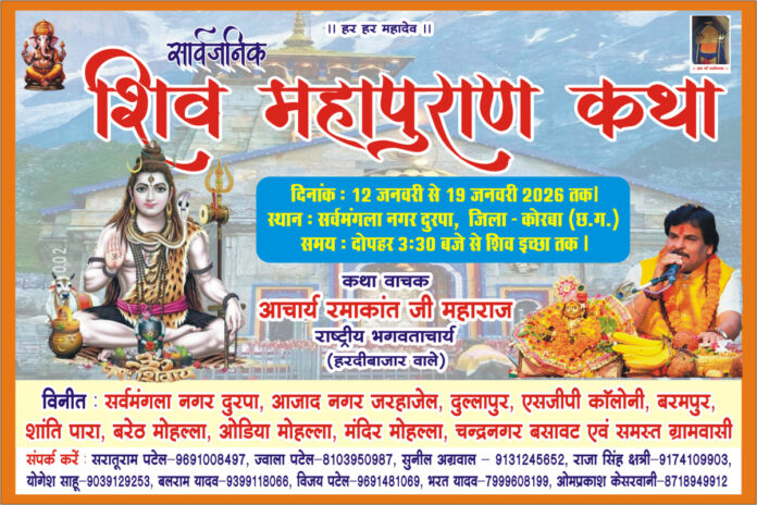 कोरबा। सर्वमंगला नगर दुरपा में मकर संक्रांति के पावन अवसर पर 12 से 19 जनवरी तक शिव महापुराण कथा का भव्य आयोजन किया जाएगा। कथा स्थल छोटा दशहरा मैदान, सर्वमंगला नगर दुरपा निर्धारित किया गया है। आयोजन समिति के अनुसार प्रतिदिन सुबह 8:30 बजे से पूजन, रुद्राभिषेक एवं आरती होगी, वहीं दोपहर 3:30 बजे से शिव महापुराण कथा शिव-इच्छा तक चलेगी। कथा के दौरान श्रद्धालुओं को प्रतिदिन सिद्ध रुद्राक्ष का वितरण भी किया जाएगा।